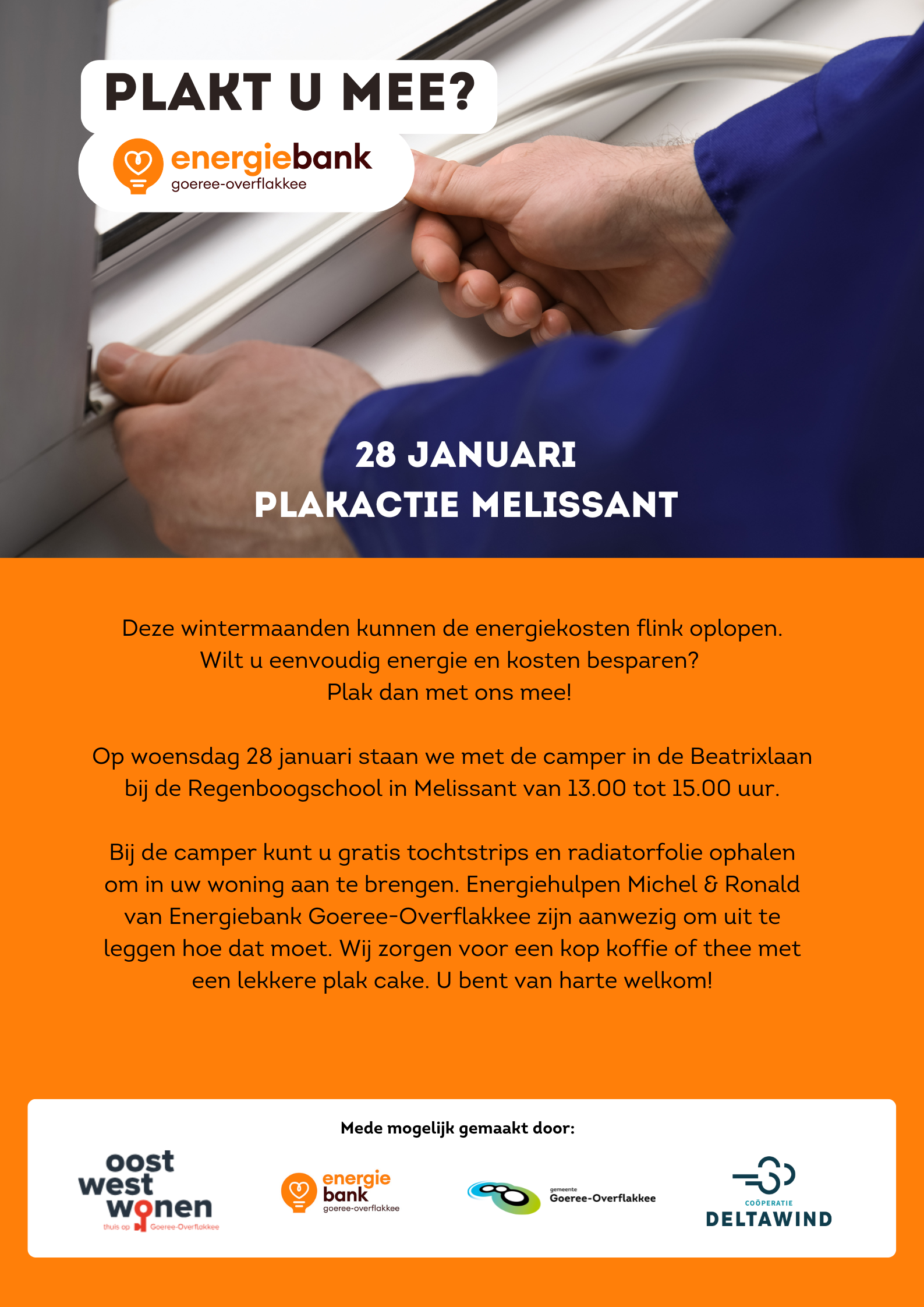 U kunt gratis tochtstrips en radiatorfolie ophalen om in uw woning aan te brengen. Energiehulpen Michel & Ronald van Energiebank Goeree-Overflakkee zijn aanwezig om uit te leggen hoe dat moet. Wij zorgen voor een kop koffie of thee met een lekkere plak cake. U bent van harte welkom!